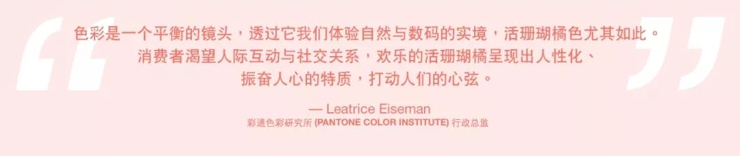 “活潑而柔美的 PANTONE 16-1546 活珊瑚橘用溫暖與養(yǎng)分擁抱我們,在不斷變動的環(huán)境中,讓我們覺得舒適愉快。”——彩通色彩研究所行政總監(jiān) Leatrice Eiseman女士如是說。